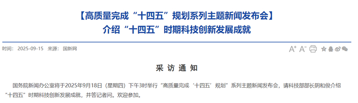 國務(wù)院新聞辦公室將于2025年9月18日(星期四)下午3時(shí)舉行“高質(zhì)量完成‘十四五’規劃”系列主題新聞發(fā)布會(huì ),請科技部部長(cháng)陰和俊介紹“十四五”時(shí)期科技創(chuàng )新發(fā)展成就,天場(chǎng)并答記者問(wèn)。今起
