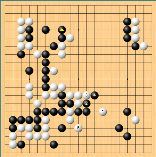 圖2:下邊的戰斗非常激烈,柯潔計算精準。右邊白1,3與黑棋交換之后,直接在5位立下,圖窮匕見(jiàn)!這里的戰斗非常復雜,但柯潔此時(shí)應該已經(jīng)是成竹在胸了。