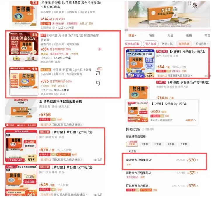 美團平臺顯示,美團自營(yíng)大藥房(快遞電商)價(jià)格為629元/粒,優(yōu)惠前價(jià)格為1200元/粒,顯示已經(jīng)銷(xiāo)售4000余件,評論區有不少消費者表示經(jīng)過(guò)掃碼驗證為正品,性?xún)r(jià)比高。而在天貓平臺,片仔癀錠劑的售價(jià)為原價(jià)760元/粒,拼多多平臺為609元/粒。