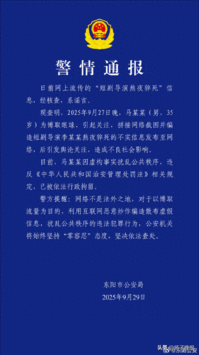 9月28日,警方劇導拘有網(wǎng)友在社交平臺發(fā)帖稱(chēng),通報一名28歲的歲短歲短劇導演李某某在浙江橫店熬夜猝死,引發(fā)關(guān)注。演李眼球隨后,某某馬某某男“曝短劇導演熬夜猝死”的被傳博取編造不實(shí)被行話(huà)題沖上熱搜。