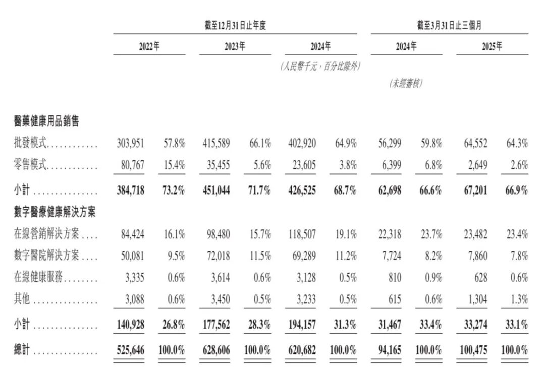 醫藥健康用品銷(xiāo)售采用批發(fā)與零售雙模式。批發(fā)模式主要服務(wù)區域醫藥貿易公司、醫療機構等企業(yè)客戶(hù),是公司的收入支柱,2025年第一季度占比達64.3%。
