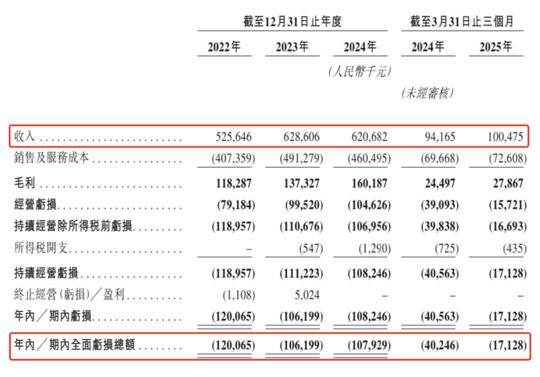 財務(wù)數據顯示:2022年~2024年,公司總收入分別為人民幣5.26億元、6.29億元和6.21億元;同期凈虧損分別為人民幣1.20億元、1.06億元和1.08億元。