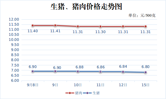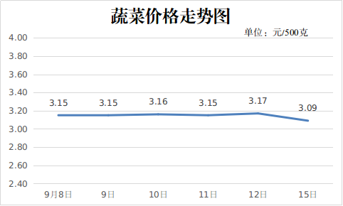 三、農產(chǎn)蔬菜價(jià)格下降。隨著(zhù)降雨的明顯減少和高濕高溫天氣的逐漸減退,蔬菜市場(chǎng)供應的穩定性明顯恢復,蔬菜的整體價(jià)格基本平穩。9月15日,重點(diǎn)監測的16種蔬菜平均價(jià)格為3.09元,周環(huán)比下降1.90%,同比下降18.04%。