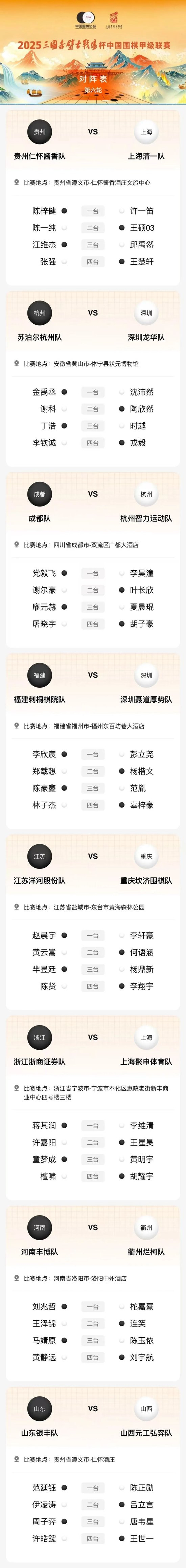 來(lái)源:中國圍棋協(xié)會(huì )2025三國赤壁古戰場(chǎng)杯中國圍棋甲級聯(lián)賽將于8月27日在四川成都、福建福州、河南洛陽(yáng)、江蘇鹽城、浙江寧波、安徽黃山、貴州遵義各主場(chǎng)進(jìn)行第六輪比賽。以下為具體對陣: