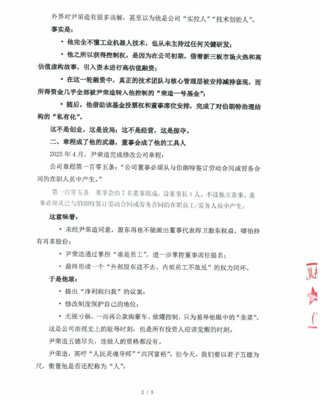 今年4月,尹榮造修改了公司章程,規定“公司董事必須從與伯朗特簽訂勞動(dòng)合同的在職人員中產(chǎn)生”。這一條款徹底堵死了股東直接委派董事的道路,形成“外部股東進(jìn)不去、內部員工不敢反”的權力閉環(huán)。
