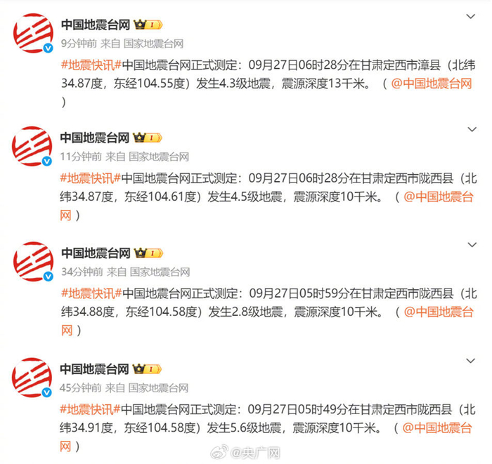 【#甘肅定西40分鐘連震4次#】#甘肅定西發(fā)生3次4級以上地震#據中國地震臺網(wǎng)正式測定:09月27日05時(shí)49分至06時(shí)28分,甘肅感明甘肅定西市發(fā)生5.6級、定西地震2.8級、分鐘4.5級、連震4.3級地震。次蘭蘭州、州天天水等地震感明顯。甘肅感明
