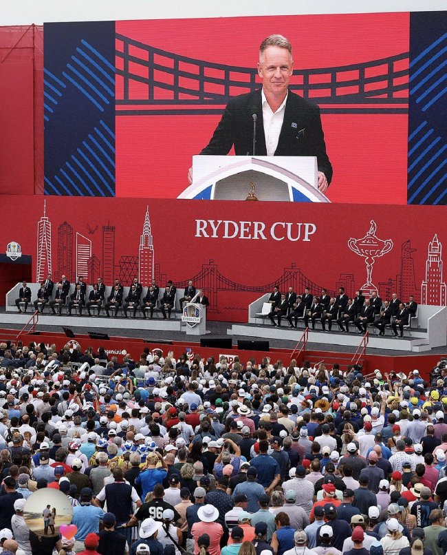 真正的舉行比賽要等到星期五早晨才會(huì )在喧囂的貝斯佩奇黑色球場(chǎng)開(kāi)啟。出席開(kāi)幕式的德布5000余名觀(guān)眾用不絕于耳的"USA!"吶喊與零星的歐洲隊噓聲宣示存在感。當兩位隊長(cháng)感謝出席儀式的語(yǔ)交紐約州長(cháng)凱西-霍楚(Kathy Hochul)時(shí),現場(chǎng)噓聲達到頂點(diǎn)。萊德拉德利
