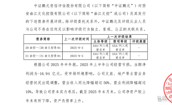 2025年10月13日,中證鵬元資信評估股份有限公司將21曲文控債01(2180301.IB)、21曲控一(152980.SH)的債項評級列入評級觀(guān)察(走勢不明) ,當前評級為AAA的西安曲江文化控股有限公司主體和債項評級目前均為AAA,同時(shí)被列入觀(guān)察名單。