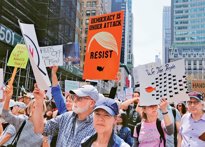 ??2025年4月19日,美國多地舉行抗議活動(dòng),華盛頓、紐約、舊金山、波士頓等城市的民眾走上街頭,抗議現政府大規模裁員、加征關(guān)稅、驅逐移民等政策。圖為當日,人們在紐約街頭參加抗議活動(dòng)。 新華社記者 劉亞南/攝