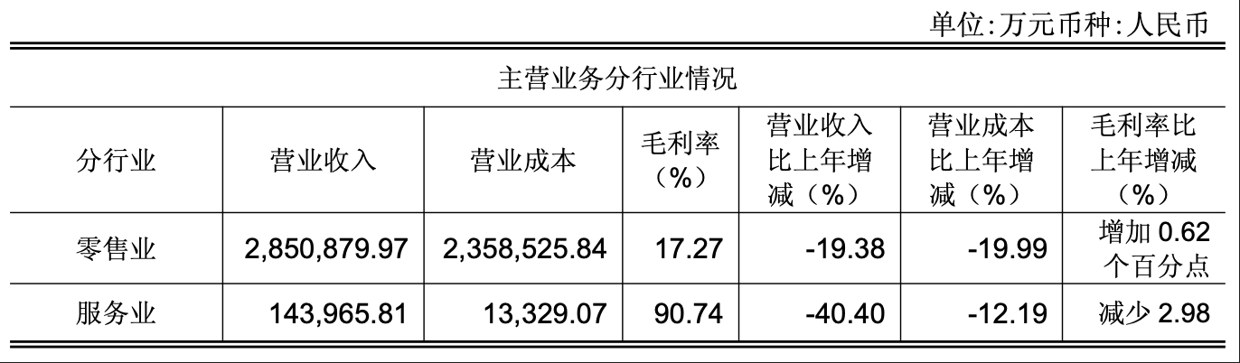 但供應鏈改革也帶來(lái)陣痛,葉國富推行裸采模式(取消中間費)精簡(jiǎn)50%供應商,雖優(yōu)化了商品結構,卻使“收租”性質(zhì)的服務(wù)業(yè)收入大降40%至14.4億元,毛利承壓。所謂“收租”,即向品牌方、供應商收取進(jìn)場(chǎng)費、條碼費、營(yíng)銷(xiāo)費等,讓商品進(jìn)場(chǎng)。過(guò)去,永輝每年從“收租”模式上賺到的營(yíng)收就接近40億元,且其毛利率高到90%以上。