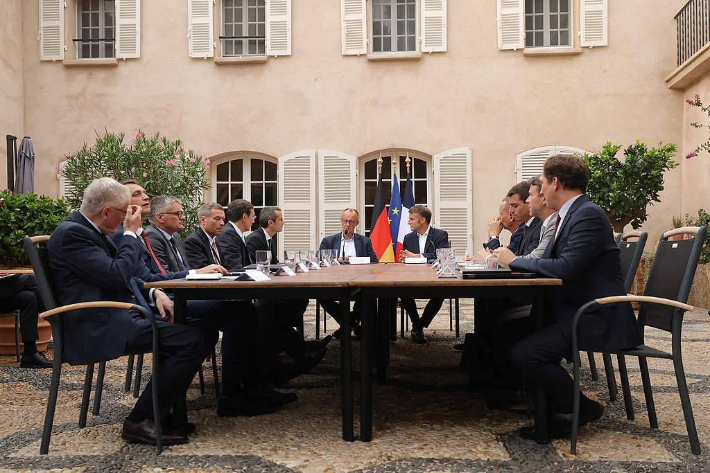 △當地時(shí)間2025年8月28日,魔力馬克龍在位于法國南部的緩解避暑官邸布雷岡松堡設工作晚宴,歡迎德國總理默茨的歐洲到訪(fǎng)。(圖自視覺(jué)中國)