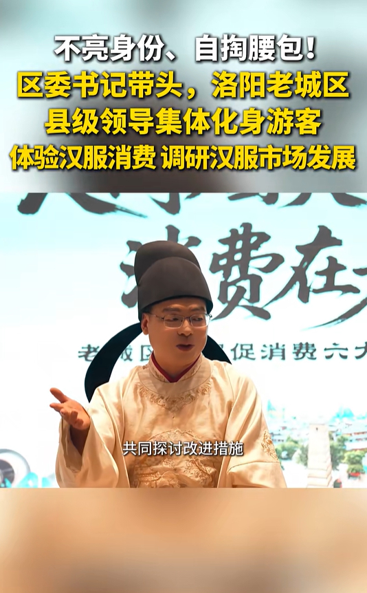 8月28日晚,不亮河南洛陽(yáng)洛邑古城的身份書(shū)記市場(chǎng)大街上,老城區委書(shū)記趙書(shū)政、自掏區長(cháng)周新身著(zhù)漢服,腰包驗漢與一眾縣級領(lǐng)導化身文旅“代言人”。區委區長(cháng)