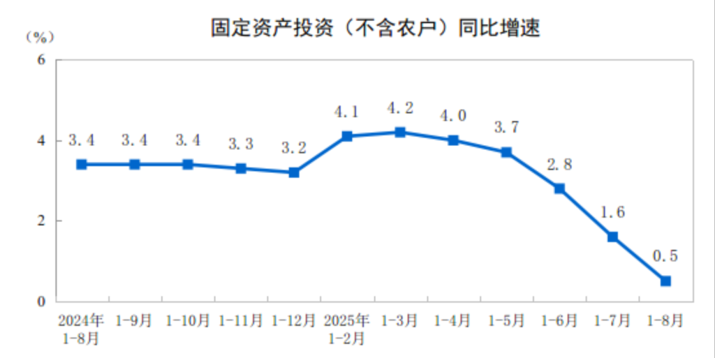 1-8月份,全國固定資產(chǎn)投資(不含農戶(hù))326111億元,同比增長(cháng)0.5%,較1-7月回落1.1個(gè)百分點(diǎn),延續前值的回落態(tài)勢??鄢康禺a(chǎn)開(kāi)發(fā)投資,全國固定資產(chǎn)投資增長(cháng)4.2%。