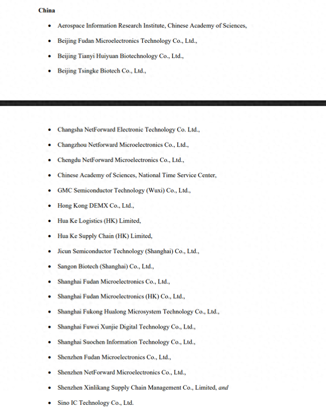美國B(niǎo)IS相關(guān)名單截圖 相關(guān)公告顯示,吉姆西半導體科技無(wú)錫)股份有限公司和吉存半導體科技上海)有限公司被美國制裁的理由是其為中芯國際及其子公司中芯北方采購設備。此外,上海復旦微電遭到了“重點(diǎn)照顧”——2025-12-01