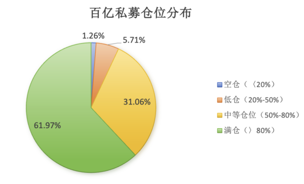 從倉位分布的變化來(lái)看,百億私募的調整幅度更為明顯。數據顯示,滿(mǎn)倉百億私募占比從前一周的37.16%大幅提升至61.97%,增幅高達24.81個(gè)百分點(diǎn)。與此同時(shí),中等倉位百億私募占比則從53.25%下降至31.06%,降幅超過(guò)20個(gè)百分點(diǎn)。低倉和空倉百億私募占比分別降至5.71%和1.26%,均處于較低水平。
