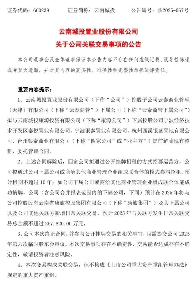 這份《公告》實(shí)際源于2025年9月10日云南城投置業(yè)股份有限公司發(fā)布的《關(guān)于公司關(guān)聯(lián)交易事項的公告》——控股子公司云泰商業(yè)管理(天津)有限公司擬與云南城投康源投資有限公司下屬控股公司寧波經(jīng)濟技術(shù)開(kāi)發(fā)區泰悅置業(yè)有限公司、寧波銀泰置業(yè)有限公司、杭州西溪銀盛置地有限公司、臺州銀泰商業(yè)有限公司提前解除現有整租、委托管理合同。