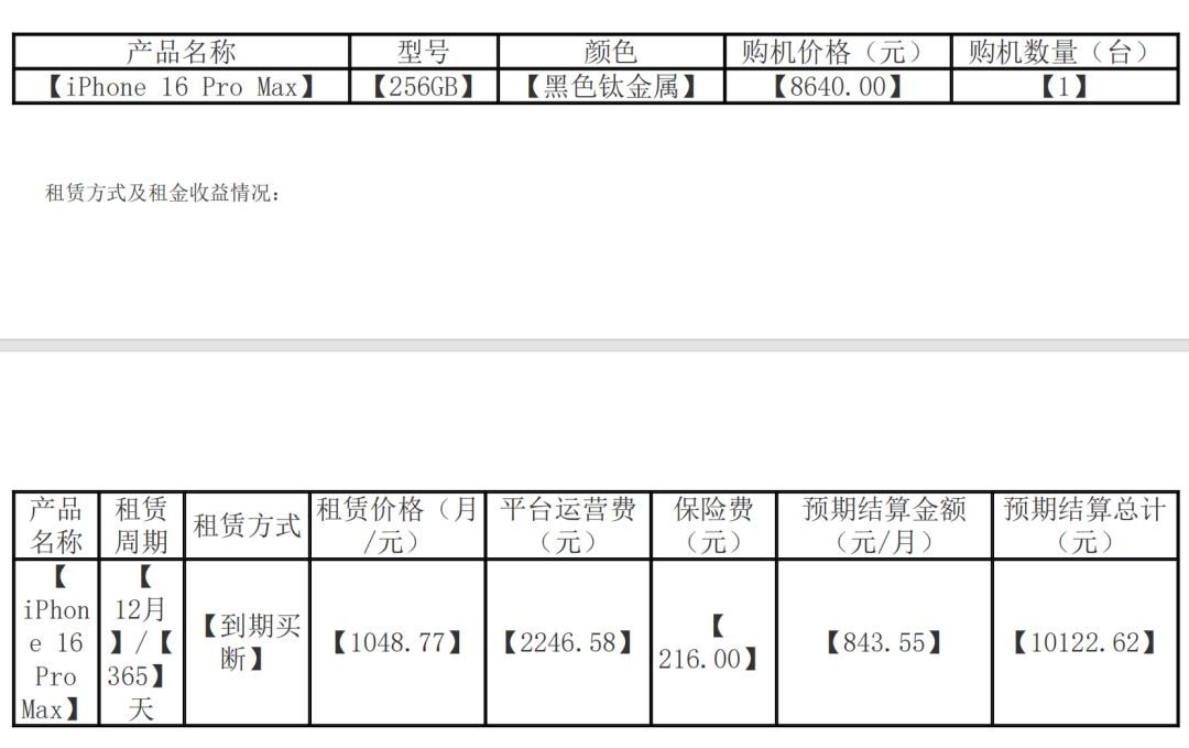 根據小也提供的租金收益明細,一臺黑色256GB的iPhone 16 Pro Max,購買(mǎi)價(jià)格8640元,以12個(gè)月租賃周期為例,扣除2246.58元平臺運營(yíng)費、216元保險費,預期收益率超過(guò)17%。