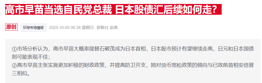消息面上,日本前經(jīng)濟安全保障擔當大臣高市早苗在上周六舉行的日本自民黨總裁選舉中勝出,由此成為自民黨首位女總裁,并有望成為日本首位女首相。