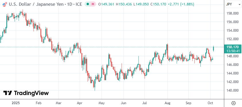 與此同時(shí),失守日元匯率明顯走低。高市行情美元兌日元升破150這一關(guān)鍵心理關(guān)口,點(diǎn)燃東京現報150.16,日經(jīng)日元漲幅超過(guò)1.8%,沖上日內一度漲至150.43,歷史是高點(diǎn)8月初以來(lái)的最高水平。