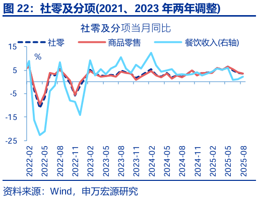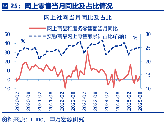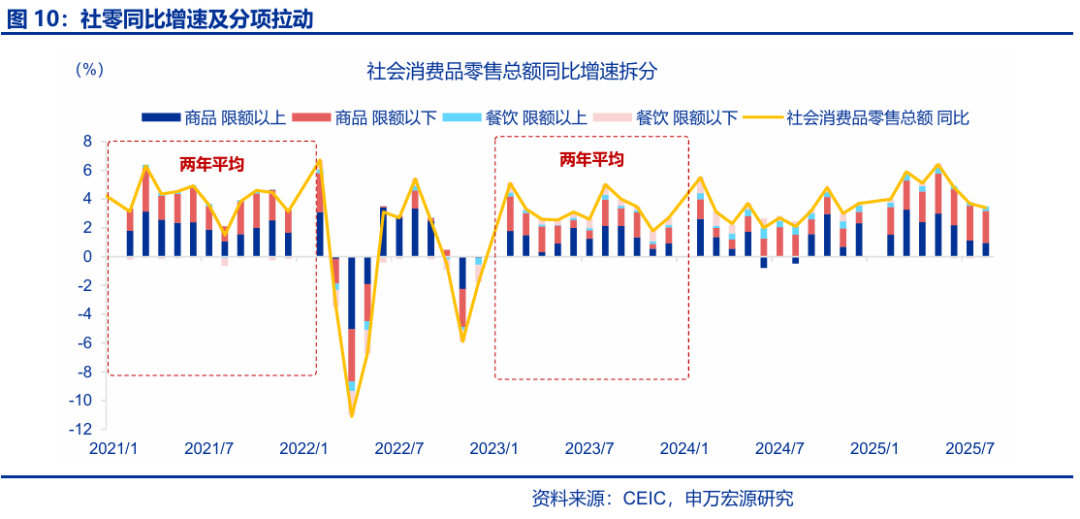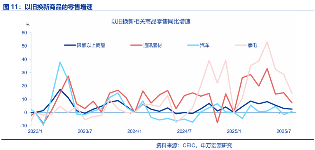 消費:部分“以舊換新”商品“退坡”特征顯現,服務(wù)消費相對平穩。8月社會(huì )消費品零售總額同比增長(cháng)3.4%,較前值下降0.3個(gè)百分點(diǎn),其中限額以下商品零售和限額以上商品零售均有所回落。限額以上商品中,雖8月份最新一批國補資金下達,但前期受益于“以舊換新”最顯著(zhù)的家電(-14.4pct至14.3%)和通信器材(-7.6pct至7.3%)增速在5月達到高點(diǎn)后仍趨于回落;汽車(chē)(+2.3pct至0.8%)小幅回暖,但增速維持在較低區間;必需品出現較明顯的回落,其中糧油食品(-2.8pct至5.8%)、煙酒(-5.0pct至-2.3%)回落幅度較大。服務(wù)消費方面,餐飲收入(+1.0pct至2.1%)小幅提振,1-8月服務(wù)零售額累計同比小幅下滑0.1個(gè)百分點(diǎn)至5.1%。