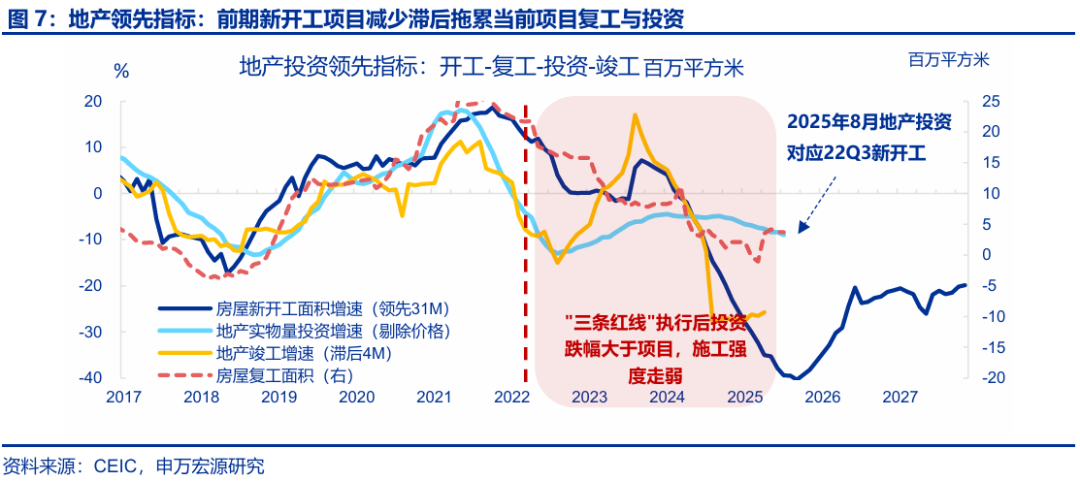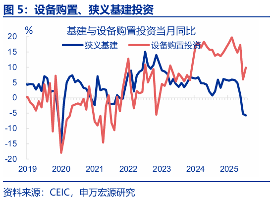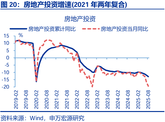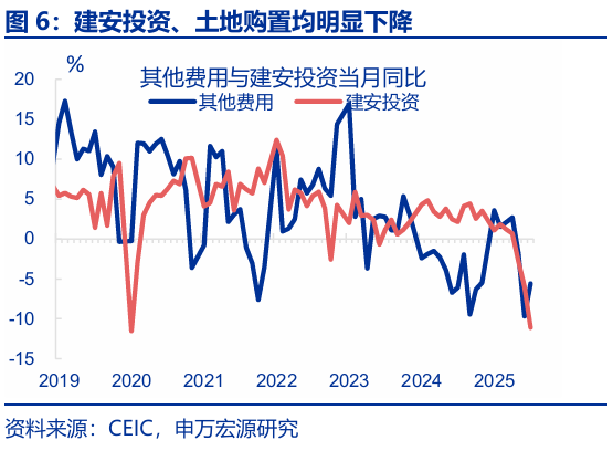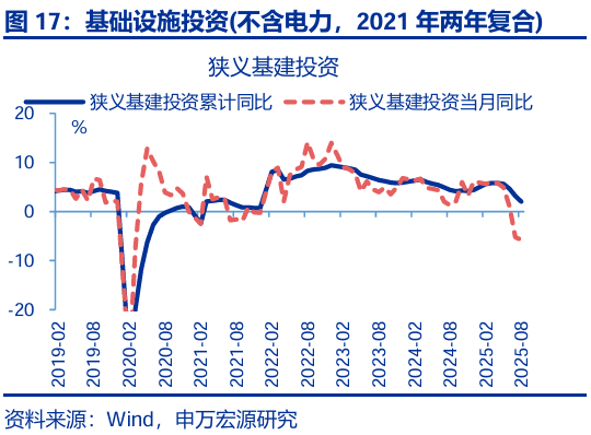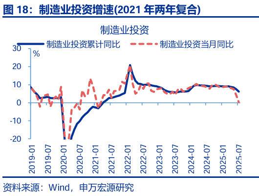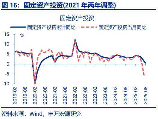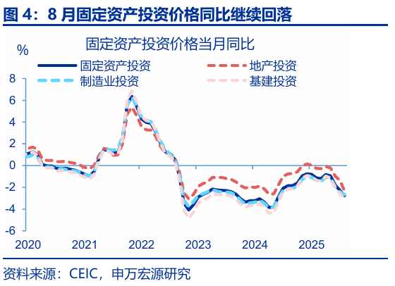 投資:8月固定投資繼續下行,主因“反內卷”對中下游投資影響開(kāi)始顯現,疊加前期新開(kāi)工持續收縮對當前地產(chǎn)投資的拖累加深。8月固定投資當月同比回落1.0pct至-6.3%,剔除價(jià)格后實(shí)際增速回落0.8pct至-4%;從投資類(lèi)型看,8月其他費用(+4.1pct至-5.6%)、設備購置(+3.8pct至9.9%)投資增速均小幅反彈,但建安投資大幅下行(-5pct至-11.1%);分投資主體看,地產(chǎn)投資回落幅度最大(-2.4pct至-19.4%),與我們地產(chǎn)領(lǐng)先指標基本吻合;制造業(yè)投資(-0.9pct至-1.2%)也明顯下行,雖然上游投資增速基本持平,但中下游如運輸設備(-36pct至7%)、汽車(chē)(-9.2pct至9.7%)等行業(yè)投資下滑幅度更大,顯示“反內卷”的政策影響開(kāi)始顯現;基建投資也出現明顯回落,主要受到公用事業(yè)投資(-8.1pct至4.3%)明顯降速的影響,狹義基建(-0.5pct至-5.8%)也偏弱。