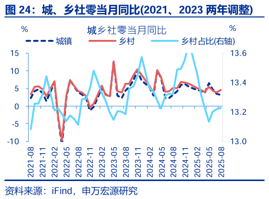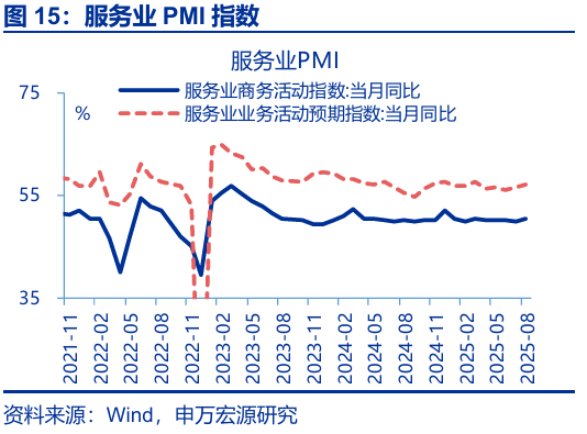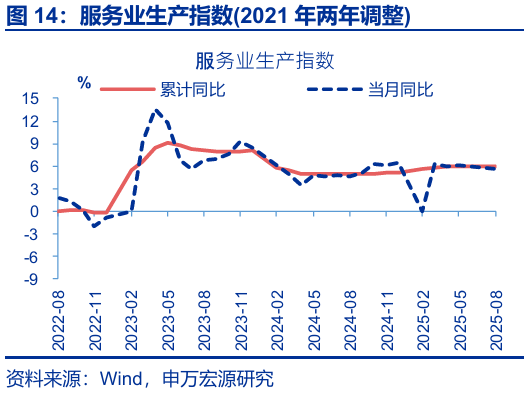 總結:反內卷對國內供需的影響開(kāi)始顯現,但外需有望繼續貢獻經(jīng)濟韌性,預計下半年經(jīng)濟下行壓力相對可控。9月經(jīng)濟繼續呈現內需偏弱、外需偏強的格局。展望后續,在新興市場(chǎng)需求份額雙提升、美國進(jìn)口仍有改善空間的背景下,我國外需壓力或相對可控。內需壓力更值得關(guān)注,在天氣影響逐步消退后,8月投資、消費、生產(chǎn)等指標出現進(jìn)一步回落,已在開(kāi)始顯現“反內卷”與前期地產(chǎn)新開(kāi)工項目持續收縮的滯后影響,加大服務(wù)業(yè)與基建投資、穩定消費需求仍非常關(guān)鍵;目前第三批以舊換新資金已下達完畢,貸款貼息等促進(jìn)服務(wù)消費、服務(wù)業(yè)投資的政策也在加速落地,新型政策性金融工具也在部署之中,后續緊密跟蹤增量政策變化。