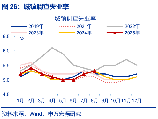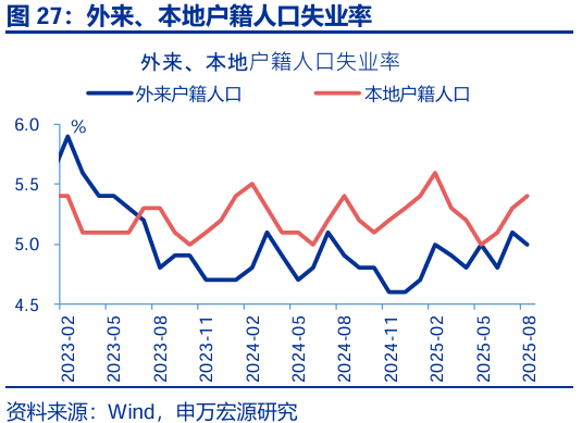就業(yè):城鎮調查失業(yè)率小幅回升,整體符合季節性。8月,城鎮調查失業(yè)率5.3%,較前月上行0.1pct,與過(guò)往6年均值持平。其中,本地戶(hù)籍(5.4%)人口失業(yè)率較前月回升0.1pct,外來(lái)戶(hù)籍(5.0%)較前月回落0.1pct。