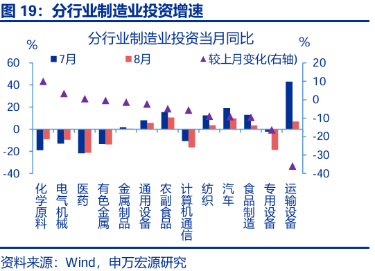 制造業(yè)投資降至四年來(lái)最低水平,裝備制造業(yè)投資降幅顯著(zhù)。8月,制造業(yè)投資明顯回落,累計同比較上月下行1.1個(gè)百分點(diǎn)至5.1%;當月同比較上月回落0.9個(gè)百分點(diǎn)至-1.2%。分行業(yè)看,運輸設備、專(zhuān)用設備、汽車(chē)等行業(yè)投資增速降幅較大,分別較前月回落36、16.4、9.2個(gè)百分點(diǎn)至7%、-18.6%、9.7%;相比之下,化學(xué)原料、電氣機械等行業(yè)投資增速漲幅較大,分別較前月上行9.9、3.4個(gè)百分點(diǎn)至-9%、-9.5%。