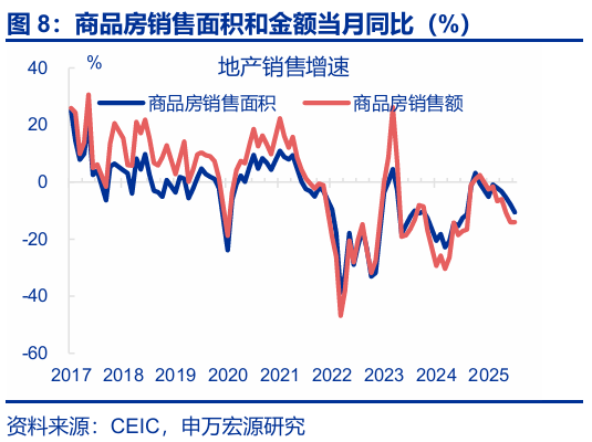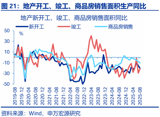 地產(chǎn)投資進(jìn)一步下行,新開(kāi)工、竣工面積延續低位。8月,房地產(chǎn)開(kāi)發(fā)投資延續回落,累計同比較前月下行0.9pct至-12.9%,當月同比較前月下滑2.4pct至-19.4%。分不同階段看,新開(kāi)工、竣工面積延續低位,當月同比分別較前月回落4.8pct至-20.3%、上行8pct至-21.4%;同時(shí)商品房銷(xiāo)售面積亦有回落,當月同比下滑2.7pct至-10.6%。