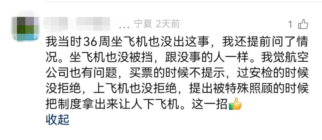 針對此種情況,業(yè)內亦有更柔性化的處理經(jīng)驗。有網(wǎng)友分享,自己在懷孕35周時(shí),從陜西西安飛內蒙古呼和浩特,在簽署《風(fēng)險告知書(shū)》明確責任后,機組人員一路上都體貼入微地照顧她,讓她感嘆“他們愿意讓我搭飛機回家,我就很感激了”。