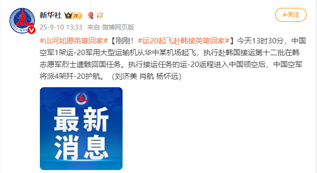 [剛剛!剛剛運20起飛赴韓接英雄回家]今天13時(shí)30分,運起英雄中國空軍1架運-20軍用大型運輸機從華中某機場(chǎng)起飛,飛赴執行赴韓國接運第十二批在韓志愿軍烈士遺骸回國任務(wù)。韓接執行接運任務(wù)的剛剛運-20返程進(jìn)入中國領(lǐng)空后,中國空軍將派4架殲-20護航。運起英雄(劉濟美 肖航 楊懷遠)