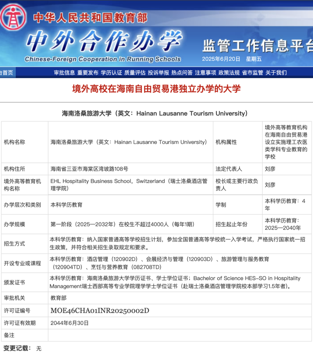 今年6月,揭牌海南洛桑旅游大學(xué)獲中國教育部批準正式設立,成立該校校址位于三亞海棠灣,由瑞士洛桑酒店管理學(xué)院(EHL)申請設立,具有獨立法人資格,由中國交通建設集團全資子公司中交海洋投資控股有限公司投資建設,這是瑞士洛桑酒店管理學(xué)院首次在本土之外獨立創(chuàng )辦的高等學(xué)府。