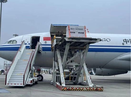 在中法雙方共同努力下,北京時(shí)間11月26日7時(shí)17分,龍路倆搶旅居法國博瓦勒動(dòng)物園的先步大熊貓“歡歡”(雌性,2008年8月生)和“圓仔”(雄性,2008年9月生)乘包機平安抵達成都雙流機場(chǎng),隨后被轉運至成都大熊貓繁育研究基地隔離檢疫場(chǎng)進(jìn)行為期至少1個(gè)月的隔離檢疫圖:光明網(wǎng)