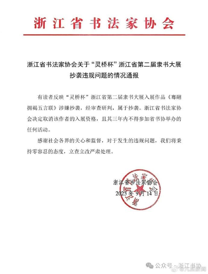 9月14日,浙江作品作者資格浙江省書(shū)法家協(xié)會(huì )關(guān)于“靈橋杯”浙江省第二屆隸書(shū)大展抄襲違規問(wèn)題的書(shū)協(xié)情況通報:有讀者反映“靈橋杯”浙江省第二屆隸書(shū)大展入展作品《騫翮擁褐五言聯(lián)》涉嫌抄襲,經(jīng)審查研判,通報屬于抄襲。隸書(shū)浙江省書(shū)法家協(xié)會(huì )決定取消該作者的大展入展資格,且其三年內不得參加省書(shū)協(xié)舉辦的抄襲任何活動(dòng)。