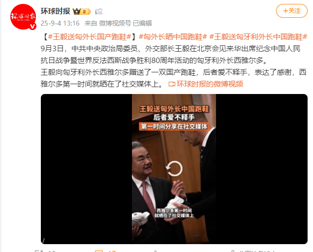 [王毅送匈外長(cháng)國產(chǎn)跑鞋] 9月3日,王毅外長(cháng)中共中央政治局委員、送匈外交部長(cháng)王毅在北京會(huì )見(jiàn)來(lái)華出席紀念中國人民抗日戰爭暨世界反法西斯戰爭勝利80周年活動(dòng)的牙利匈牙利外長(cháng)西雅爾多。 王毅向匈牙利外長(cháng)西雅爾多贈送了一雙國產(chǎn)跑鞋,國產(chǎn)后者愛(ài)不釋手,跑鞋表達了感謝,王毅外長(cháng)西雅爾多第一時(shí)間就曬在了社交媒體上。送匈