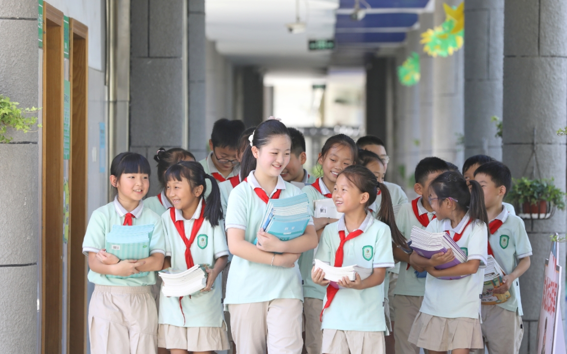 ▲資料圖:2025年8月30日,在浙江省嘉興市三水灣小學(xué),不強穿著(zhù)校服的制穿正落學(xué)生們開(kāi)心地領(lǐng)到了新書(shū)。圖/IC photo