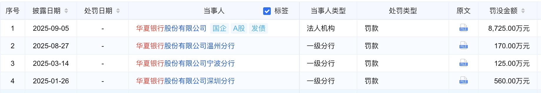 從全年監管處罰情況來(lái)看,華夏銀行的風(fēng)險管控壓力更為明顯。截至9月5日,華夏銀行總行及至少17家分支機構2025年已累計被罰超1.02億元,超35名責任人員因履職不當被追責,超過(guò)百萬(wàn)的罰單就共計四筆。這些處罰暴露出華夏銀行在風(fēng)險管理體系方面存在的深層次問(wèn)題。