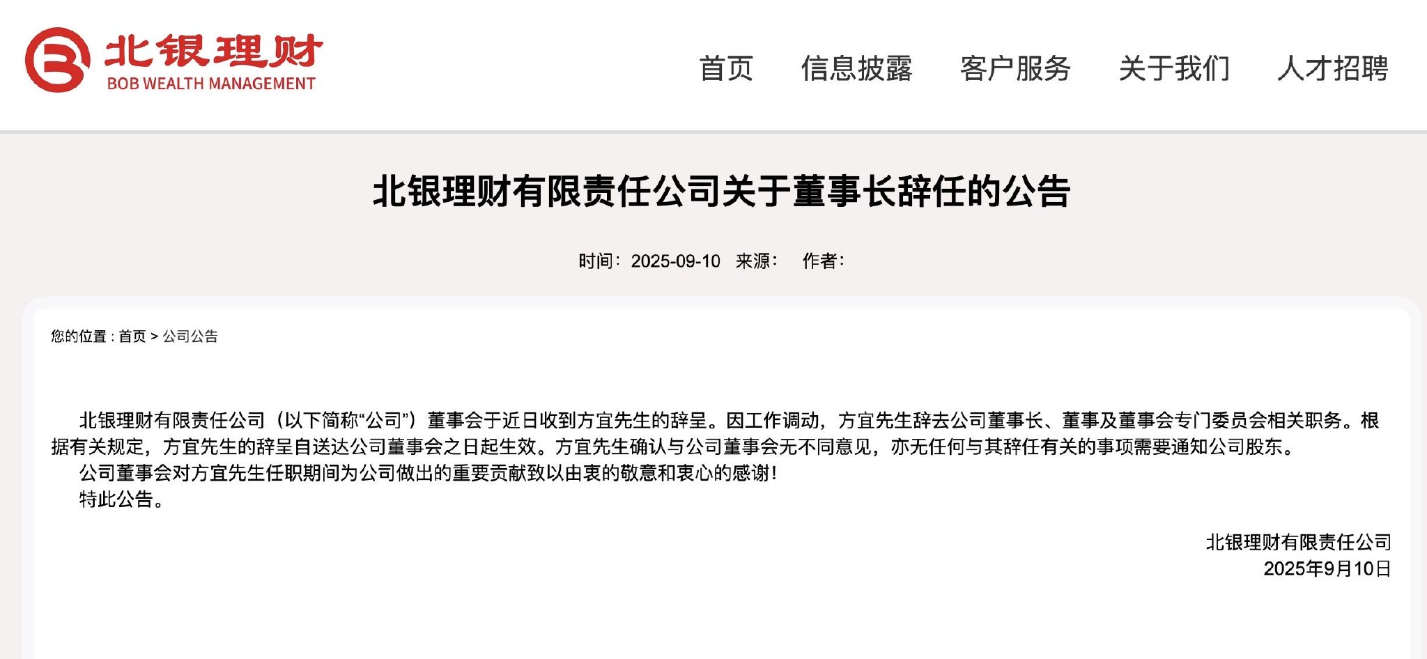 在方宜離任后,董事北銀理財董事長(cháng)職責暫由公司總經(jīng)理郭振濤代為履行,長(cháng)方以確保公司經(jīng)營(yíng)管理的宜任銀行連續性與穩定性。這是職不足月北銀理財自2022年11月成立以來(lái)第二次更換董事長(cháng),首任董事長(cháng)步艷紅同樣因工作調動(dòng)于2025年6月離任,任職時(shí)間也不足三年。