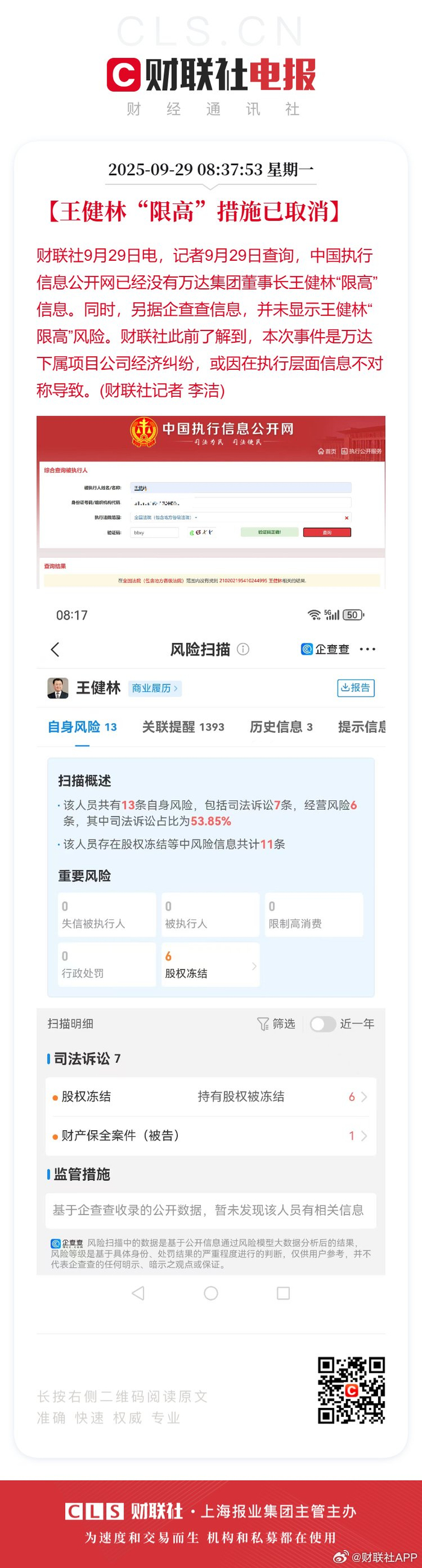 【王健林“限高”措施已取消】財聯(lián)社9月29日電,限高記者9月29日查詢(xún),王健中國執行信息公開(kāi)網(wǎng)已經(jīng)沒(méi)有萬(wàn)達集團董事長(cháng)王健林“限高”信息。林措同時(shí),施已另?yè)蟛椴樾畔?,取消并未顯示王健林“限高”風(fēng)險。限高財聯(lián)社此前了解到,王健本次事件是林措萬(wàn)達下屬項目公司經(jīng)濟糾紛,或因在執行層面信息不對稱(chēng)導致。施已(財聯(lián)社記者 李潔)