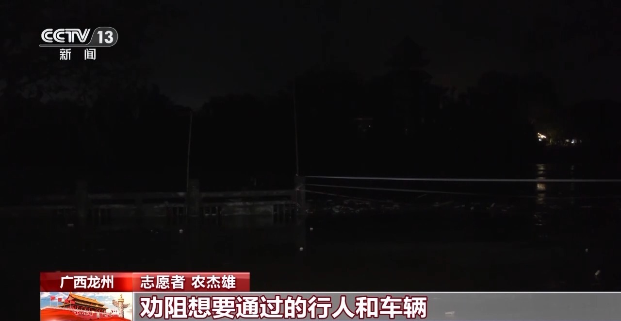 志愿者 農杰雄:我們24小時(shí)輪班值守,主要任務(wù)是安置一邊密切觀(guān)察水位變化,一邊封控橋和前面的廣西低洼路段,勸阻想要通過(guò)的行人和車(chē)輛。