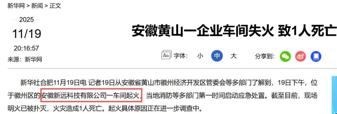 記者19日從安徽省黃山市徽州經(jīng)濟開(kāi)發(fā)區管委會(huì )等多部門(mén)了解到,19日下午,位于徽州區的安徽新遠科技有限公司一車(chē)間起火,當地消防等多部門(mén)第一時(shí)間啟動(dòng)應急處置。截至目前,現場(chǎng)明火已被撲滅,火災造成1人死亡。