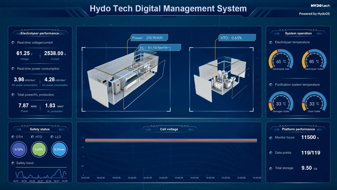 優(yōu)越性能之外,HydoLyser?更是數字原生的制氫系統。結合HydoLyser?插片式構型與自研HydoOS?綠氫智能管理系統,海德氫能為客戶(hù)打造覆蓋全生命周期內的電解槽健康狀態(tài)監測與運維服務(wù)能力,基于HydoOS??CVM技術(shù)可實(shí)時(shí)監控單個(gè)小室的健康狀態(tài),對于已識別的故障單片可在項目現場(chǎng)12小時(shí)之內完成快速的更換或升級,并嚴格遵循石化行業(yè)標準建立了完整的現場(chǎng)操作流程,運維成本降低至少90%以上,解決行業(yè)核心痛點(diǎn)。