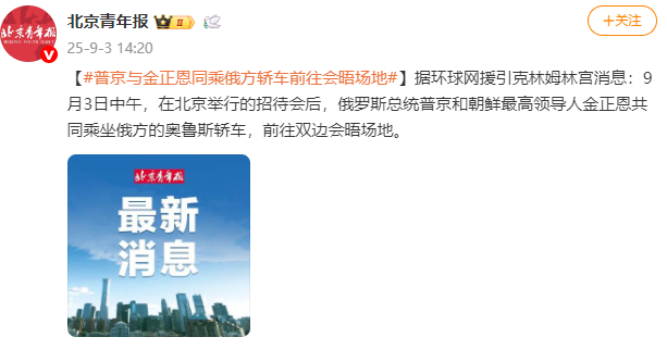 來(lái)源:北京青年報[普京與金正恩同乘俄方轎車(chē)前往會(huì )晤場(chǎng)地]據環(huán)球網(wǎng)援引克林姆林宮消息:9月3日中午,在北京舉行的招待會(huì )后,俄羅斯總統普京和朝鮮最高領(lǐng)導人金正恩共同乘坐俄方的奧魯斯轎車(chē),前往雙邊會(huì )晤場(chǎng)地。