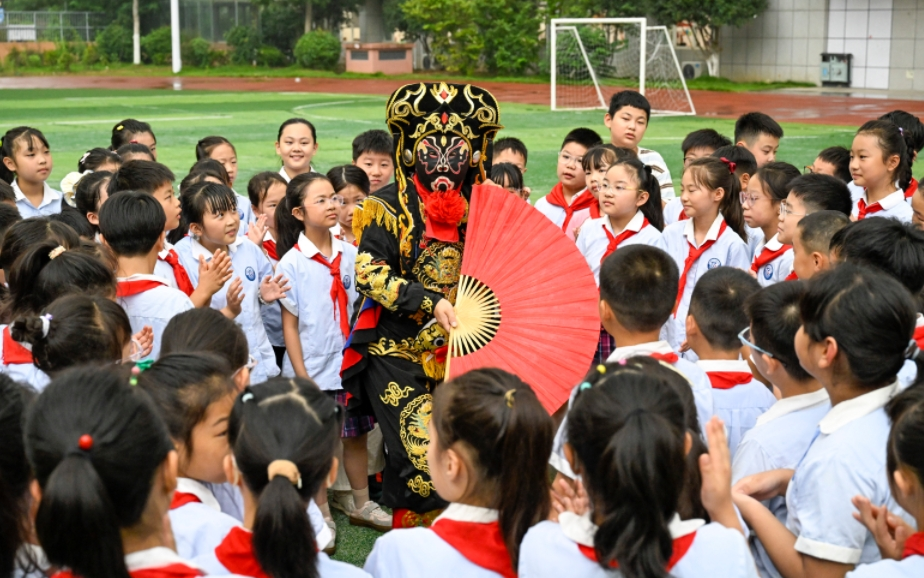 ▲2025年9月1日,在安徽省合肥市廬陽(yáng)區林店街道六安路小學(xué)榮城花園分校,時(shí)代川劇變臉演員正在與小學(xué)生們互動(dòng)游戲。過(guò)去圖/IC photo
