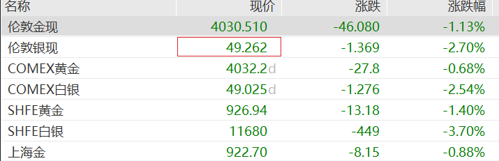 大宗商品方面,倫敦金現跌1.13%報4030.51美元/盎司,倫敦銀現跌2.7%報49.262美元/盎司。