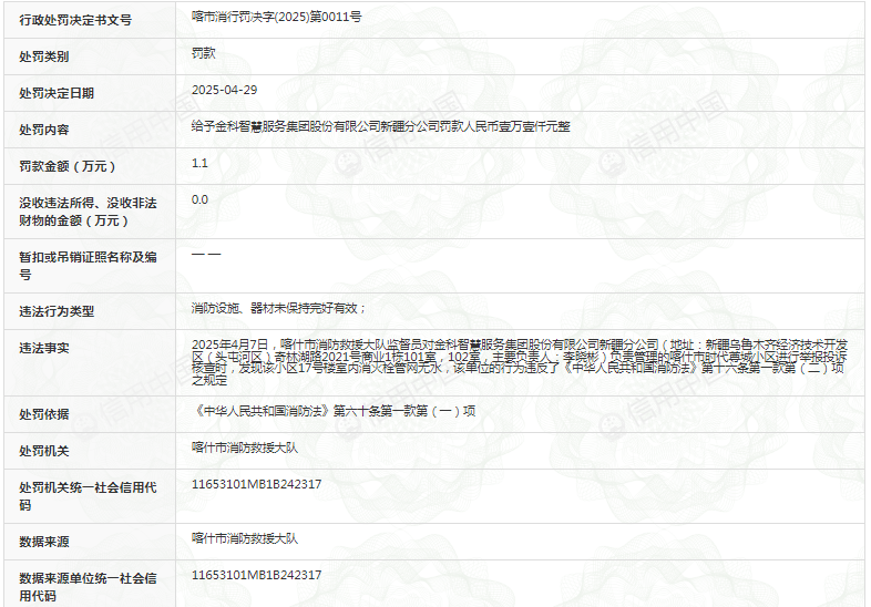 內容顯示,金科金科服務(wù)新疆公司的服務(wù)分公罰消防控防職違法事實(shí)為:2025年9月17日,烏魯木齊市消防救援支隊經(jīng)濟技術(shù)開(kāi)發(fā)區大隊監督員對頭屯河區科創(chuàng )東二巷261號金科文秀雅苑(物業(yè)管理單位:金科服務(wù)新疆公司)進(jìn)行檢查時(shí),司領(lǐng)發(fā)現該單位存在消防控制室值班操作人員未取得消防職業(yè)資格(控制室缺少1名值班人員,制室值班當日值班員無(wú)中級證)的操作違法行為,違反了《新疆維吾爾自治區消防條例》第四十八條第二款之規定。得消