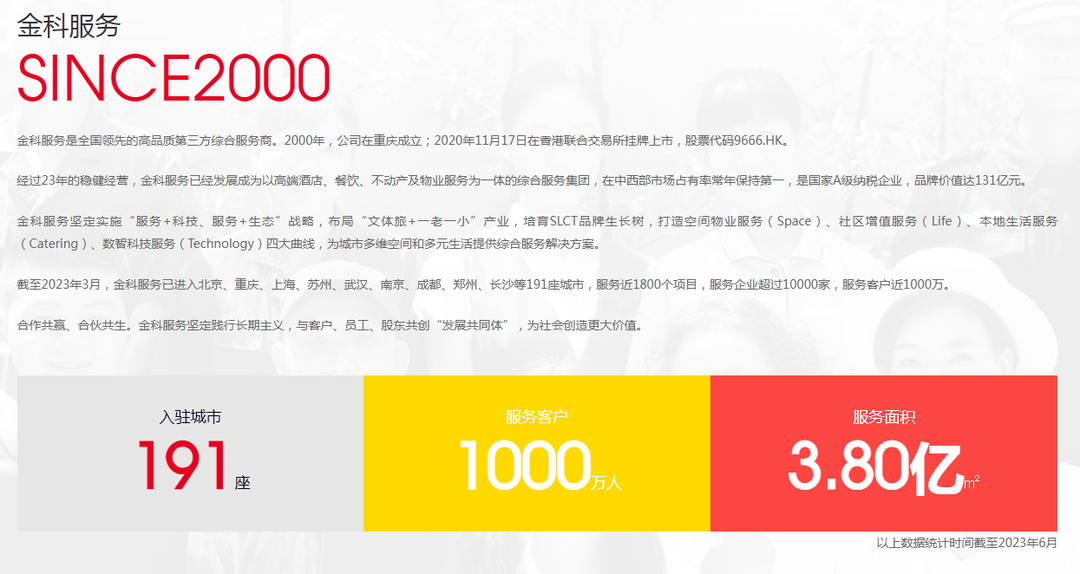 據其官網(wǎng)介紹,金科服務(wù)是全國領(lǐng)先的高品質(zhì)第三方綜合服務(wù)商,2020年11月17日在香港聯(lián)合交易所掛牌上市,股票代碼9666.HK。金科服務(wù)已經(jīng)發(fā)展成為以高端酒店、餐飲、不動(dòng)產(chǎn)及物業(yè)服務(wù)為一體的綜合服務(wù)集團,在中西部市場(chǎng)占有率常年保持第一,是國家A級納稅企業(yè),品牌價(jià)值達131億元。