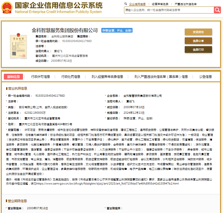 國家企業(yè)信用信息公示系統顯示,金科智慧服務(wù)集團股份有限公司新疆分公司成立于2015年,負責人為李曉彬。其母公司金科智慧服務(wù)集團股份有限公司成立于2000年,法定代表人為夏紹飛。