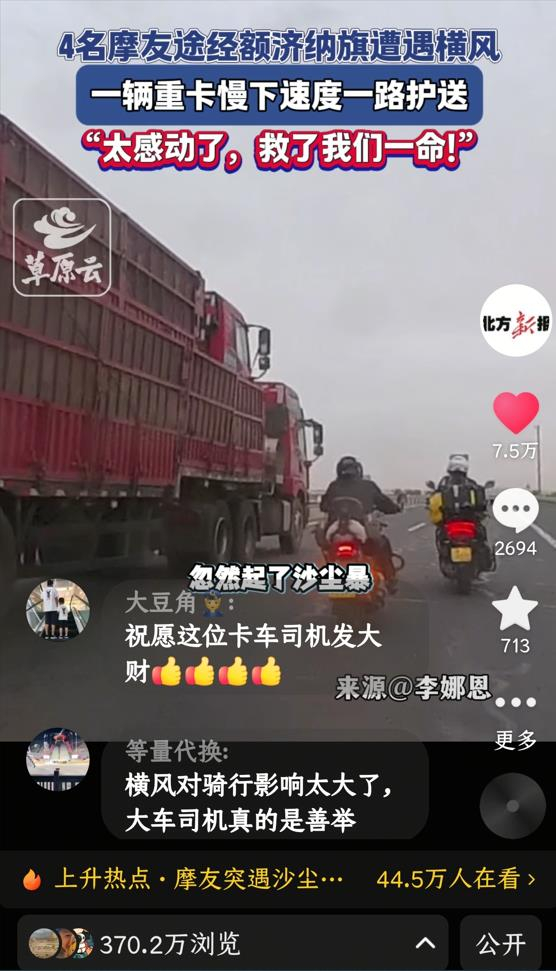 9月5日,身護送摩李娜與3名同伴騎行途經(jīng)阿拉善盟額濟納旗京新高速段時(shí),移動(dòng)屏障突遇強沙塵暴,橫風(fēng)環(huán)生橫風(fēng)裹挾沙礫呼嘯而至,突襲摩托車(chē)瞬間被吹得左右搖晃,險象即便幾人緊握車(chē)把,?重車(chē)身仍難以穩住,卡化加之能見(jiàn)度不足5米,身護送摩危險步步緊逼。移動(dòng)屏障危急時(shí)刻,一輛重卡挺身而出,一路護送他們平安駛出橫風(fēng)區。此事經(jīng)北方新報抖音官方賬號報道后,迅速引發(fā)全國網(wǎng)友關(guān)注。短短一天,視頻播放量突破370萬(wàn),收獲7.5萬(wàn)次點(diǎn)贊。北京網(wǎng)友@等量代換:“橫風(fēng)對騎行影響太大了,大車(chē)司機這真是救命的善舉!”內蒙古網(wǎng)友@望遠鏡的眼睛:“為善良的司機師傅點(diǎn)贊,這就是草原上的溫暖!”新疆網(wǎng)友@梵修:“輪子上承載的都是生活,相互幫扶本就是人心底色?!?/p>