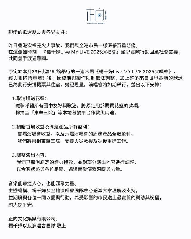 原定于本月29日起于紅館舉行的場(chǎng)演唱一連六場(chǎng)《楊千嬅Live MY LIVE 2025演唱會(huì )》,經(jīng)與團隊慎重商討后,收益因檔期與制作限制無(wú)法調整,香港消原加上許多來(lái)自世界各地的救援及災建工歌迷已為此行安排機票與住宿,幾經(jīng)思量,演唱會(huì )將如期舉行,并作出以下安排: